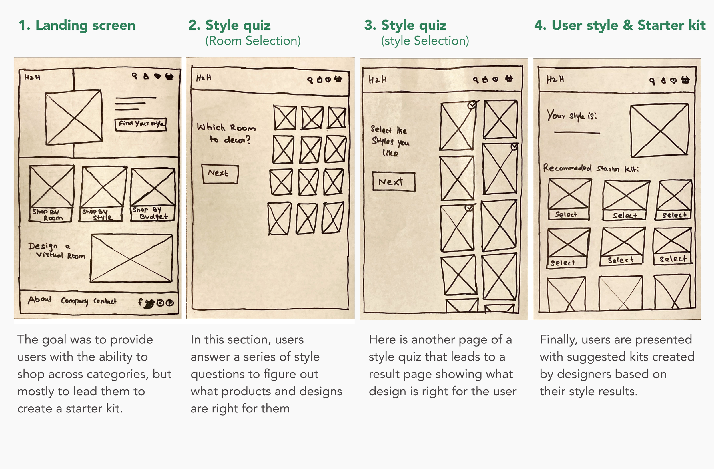 I sketched a four-screen storyboard for the users and how they work through to find their style and recommendation starter kit with the ‘Find your style’ option.