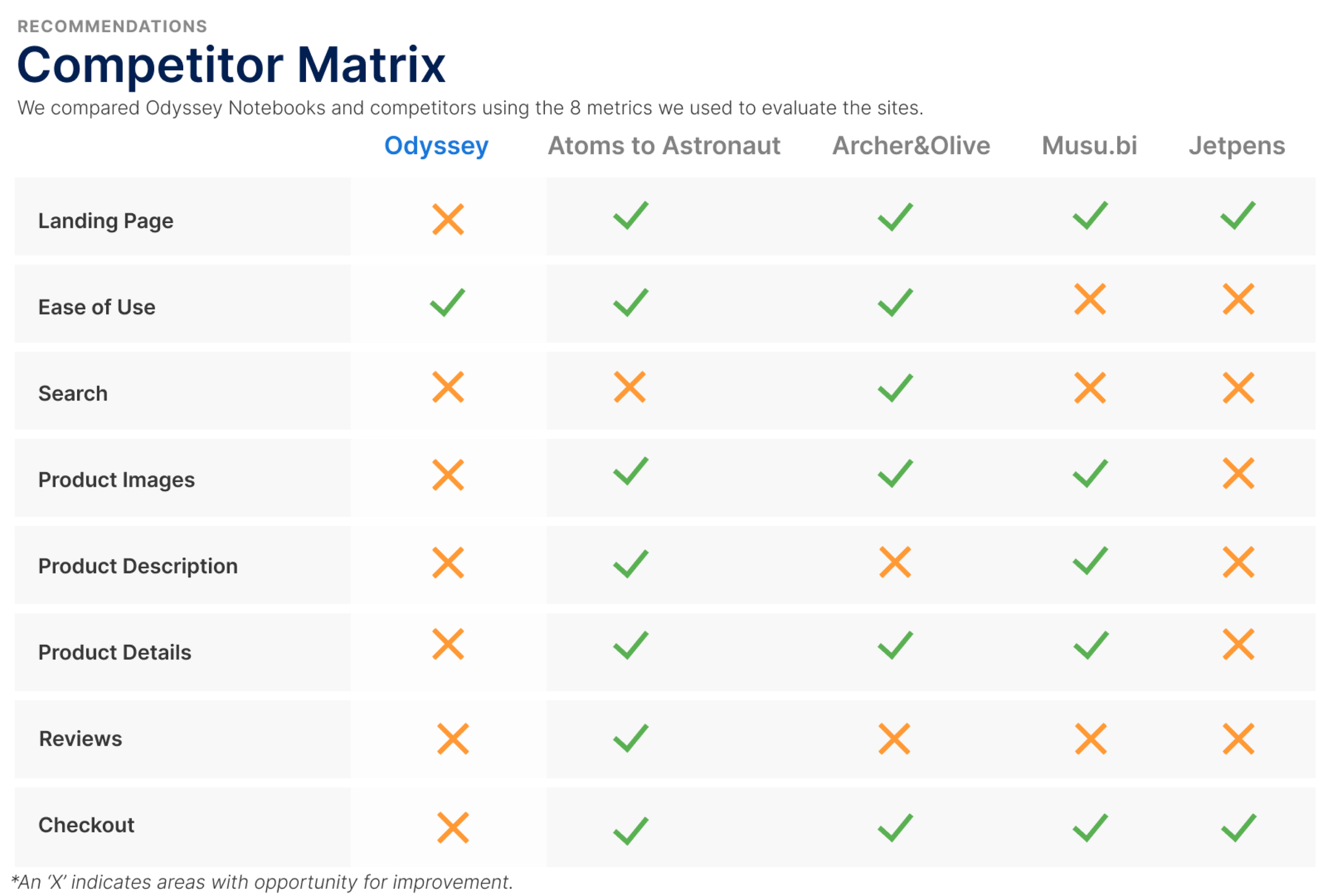 Our team conducted an in-depth analysis of market research on prominent competitors, including ODYSSEY, MUSUBI, ATOMS TO ASTRONAUTS, ARCHER & OLIVE, and JETPENS. The primary aim was to gain valuable insights into how these companies have crafted their customer experiences.