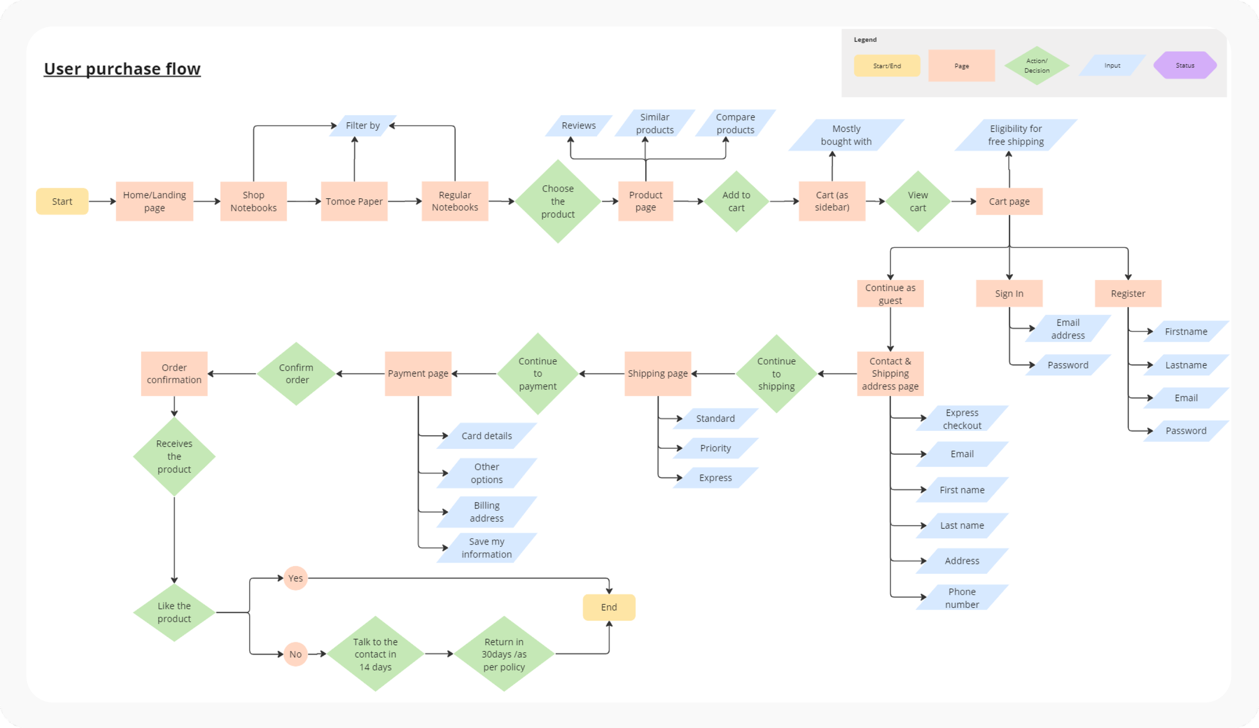 Based on the ideal sitemap, I outlined the sequential steps that a user will undertake to complete the product purchase.